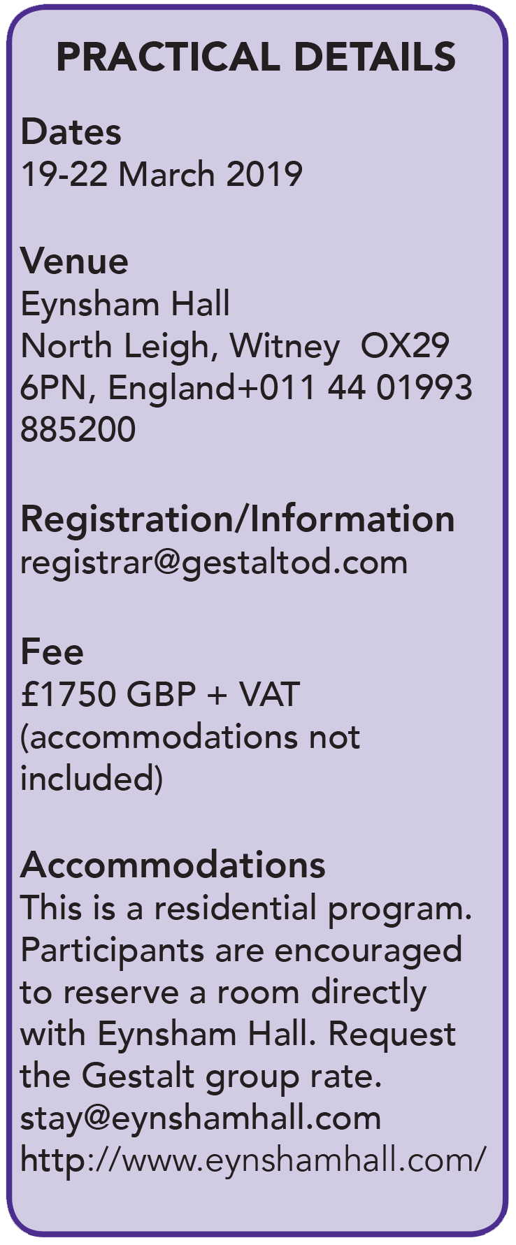 For payment information, contact registrar [at] gestaltod.com ![]()